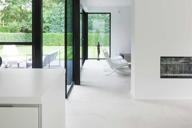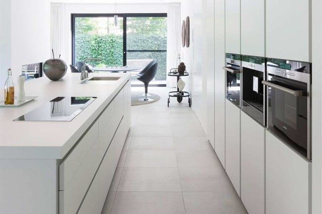 Zo gesloten als de voorgevel is, zo open is de achtergevel. Grote glaspartijen met weggewerkte aluminium profielen, op zowel het gelijkvloers als op de eerste verdieping, garanderen een grote lichtinval, het ganse jaar door. Het gelijkvloers werd opgebouwd in L-vorm, wat aan de woning extra dynamiek en aan het buitenterras de nodige privacy verleent. “We hebben gewerkt met kleine oversteken en inspringend glas op de eerste verdieping om meer reliëf te geven aan de achtergevel,” aldus Egide. “We hebben die keuze niet alleen uit esthetische overwegingen gemaakt, maar ook vanuit praktisch oogpunt. Op deze manier wordt de woning beschermd tegen direct zonlicht en slagregen.” De keuken is van Bulthaup en heeft een centraal eiland, dat evenwijdig loopt met het wandhoge schuifraam. Zowel het blok als de kasten zijn greeploos en gemaakt uit witgelakte mdf, het werkvlak is uit Duropal kunststof. De dampkap, lichtpunten en het ventilatiesysteem zijn ingewerkt in een lijvig plafondblok, dat dezelfde afmetingen heeft als het eiland, ongeveer vier meter lang. De deur van de berging is plafondhoog en pivoterend, wat ze haast doet verdwijnen in de wand.Geen inkijk