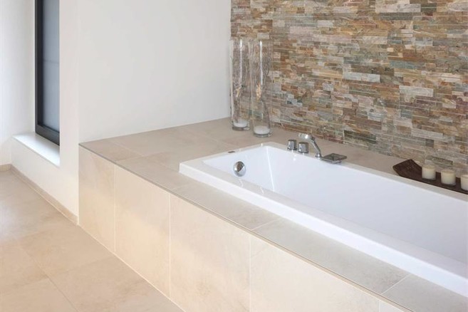 Een trap met een voleiken bekleding leidt naar de eerste verdieping en geeft zicht op een mooie binnenpatio met witte sierkeien en een exotische olijfboom. Ook de master bedroom geeft uit op deze patio, terwijl aan de andere kant een tweede raam uitzicht biedt over de tuin. “Twee vliegen in één klap,” aldus de bouwheer. “Het bed bevindt zich letterlijk tussen twee ramen, wat maakt dat het buitengevoel in de slaapkamer ongemeen hoog is. Een ideetje van de architect, maar door ons bijzonder gewaardeerd.” Op de eerste verdieping liggen nog twee extra slaapkamers, een douchecel en een grotere badkamer. In deze laatste ligt dezelfde keramische tegel als op het gelijkvloers, maar dan niet alleen als vloerbedekking, maar ook als bekleding voor het bad en de douche. Leuk detail zijn nog de natuurstenen strips boven het bad, die aan het interieur een speels effect geven. De badkamermeubelen zijn op maat gemaakt uit witgelakte mdf. Onderaan het wastafelmeubel zijn tl-lampen ingewerkt, wat voor een indirect en gezellig licht in de badkamer zorgt.Keniaanse krijger
