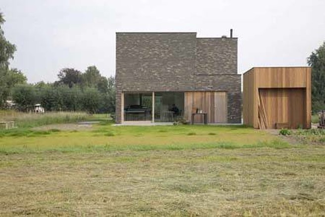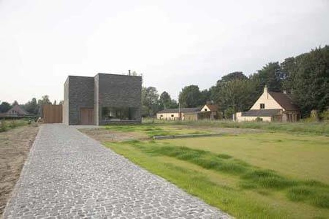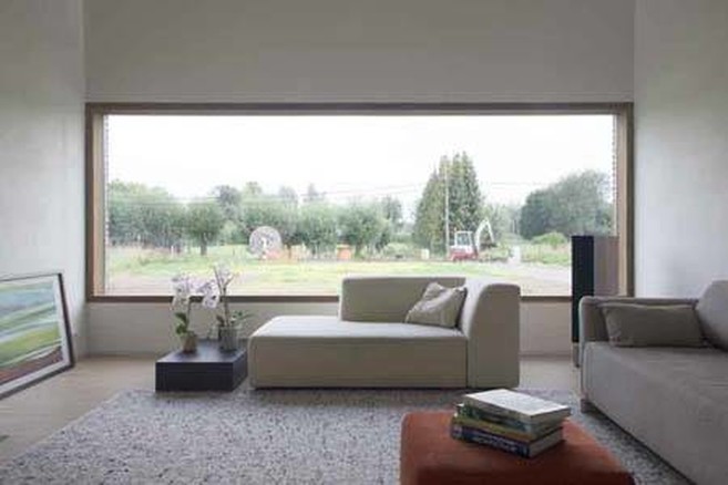 Van op straat bekeken, heeft de woning een vreemde oriëntatie. Ze ligt dertig meter van de straatgrens af, in een landelijke context met boerderijen en kastelen. De woning van de bouwheer paste dan ook best in dat plaatje. Het interieur mag dan wel volledig wit zijn, die wordt doorbroken door de warmte van een opgewaardeerde parket.