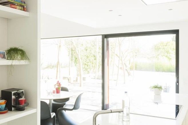Het hergebruik van een oud gebouw is al duurzaam op zich, stelt Pieter Verfaillie. “Dat geldt ook voor de binnenste doos in houtskeletbouw, uitgewerkt met ecologische bouwmaterialen en voor de techniek van het luchtdicht bouwen die we hier toepasten. Ook bij het bepalen van de raamopeningen en de detaillering van die ramen spelen duurzame aspecten mee. Zo zorgen de uitkragende stalen raamkaders en de lindebomen in de tuin er voor dat de ruimtes binnen niet oververhit geraken.” Pieter koos ook voor doorgedreven technische oplossingen in het kader van energiezuinig bouwen.