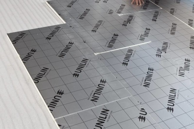 De isolatie wordt in dit geval als derde stap in de vloeropbouw geplaatst. Na de betonnen draagvloer worden de leidingen met een uitvullingslaag geplaatst. Op deze vlakke ondergrond komen vervolgens de vlakke isolatieplaten. -
