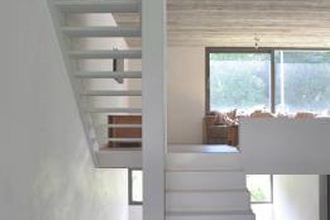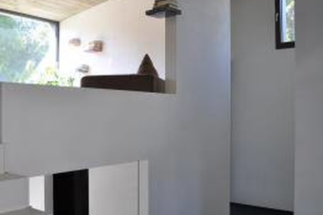 Binnen is er wisselwerking tussen de verschillende functies, die ondergebracht zijn op verschillende tussenverdiepingen. De splitlevel indeling maakt een maximale benutting mogelijk van het bouwvolume, dat relatief compact is gehouden naar het voorbeeld van de aangrenzende huizen. Half ondergronds bevindt zich een bureau. Een halve verdieping hoger, bereikbaar door een korte trap, zijn de eetkamer, de keuken en de woonkamer ondergebracht. Op de volgende tussenverdiepingen vinden we drie slaapkamers, een badkamer en een kleine dressing en ten slotte een polyvalente zolder.Als de architectuur luistert naar budgettaire beperkingen