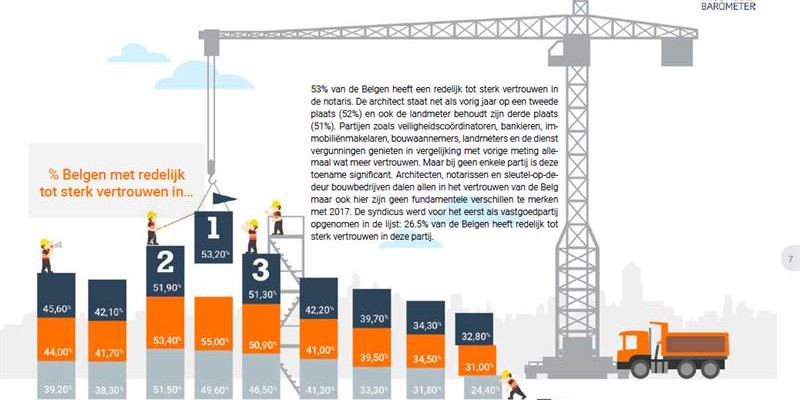 De Real Estate Trust Barometer buigt zich ook over de reputatie van de vastgoedsector en haar professionals, en analyseert dus de perceptie die er bij het gros van de Belgen leeft. Wat we daarbij zien, is dat het vertrouwen minimaal gedaald tegenover het jaar voordien. Meer dan de helft van de Belgen (53%) heeft qua perceptie nog steeds het meeste vertrouwen in de notaris. Net als de vorige peiling volgen de architect en de landmeter op plaats twee en drie. Voor het eerst werd ook gepeild naar het imago van de syndicus. Meer dan 1 op 4 Belgen (27%) blijkt echt positief te staan tegenover de beheerder van hun mede-eigendommen.