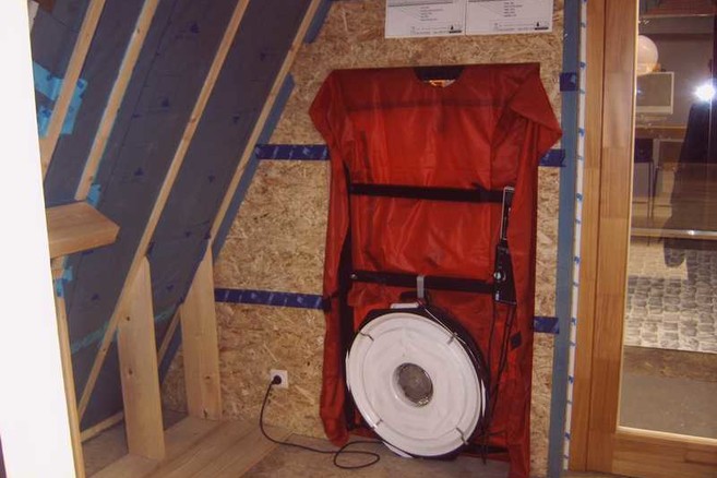 Luchtdichting wordt gemeten met een “blowerdoor” test. Hiertoe wordt in de opening van de voordeur een plastic zeil gespannen waarin een ventilator en een aantal meettoestellen zijn bevestigd. De ventilator zuigt eerst permanent lucht in de woning gezogen – overdruk. Hierbij wordt gemeten hoeveel lucht men in de woning moet pompen om een constante druk in de woning te houden. Zo weet je dus ook hoeveel lucht er via de resterende lekken naar buiten kan.