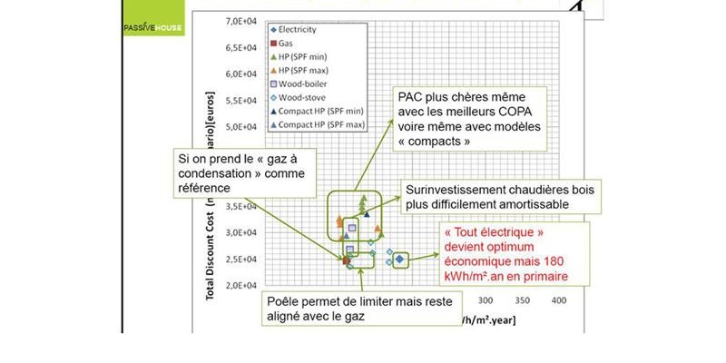 In onderstaande grafieken vind je een vergelijkende studie naar de totale kost van een verwarmingsinstallatie. Dus zowel de installatiekost als het volledige verbruik. In grafiek 1 zie je een simulatie voor woningen met een warmtevraag van 120 kWh/m² per jaar, een E100 woning. Op de Y-as staat de totale kost. Op de X-as het verbruik in primaire energie. Je merkt dat HP (SPF max) het beste scoort. Dit zijn warmtepompen met een hoog rendement. De zogenaamde water/water of aarde/water warmtepompen. Warmtepompen die de warmte uit de grond halen. Een dure installatie die zich op lange termijn terugverdient door het zeer lage verbruik.