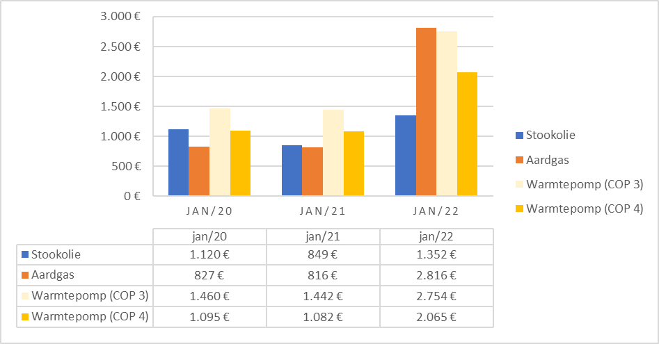 Wie in 2021 al investeerde in de energiezuinige warmtepomp blijkt vandaag ook financieel de goede keuze te hebben gemaakt. Als we de jaarlijkse verbruikskost per verwarmingstechnologie voor een gemiddelde woning met een standaardverbruik vergelijken, blijkt dat het gebruik van een lucht-waterwarmtepomp (herkenbaar aan een ‘airco-unit’ die buiten staat) goedkoper is geworden dan een gasketel. Een geothermische warmtepomp (met een grondboring) kost in zijn verbruik zelfs 20% minder, door zijn goede rendement (COP 4).