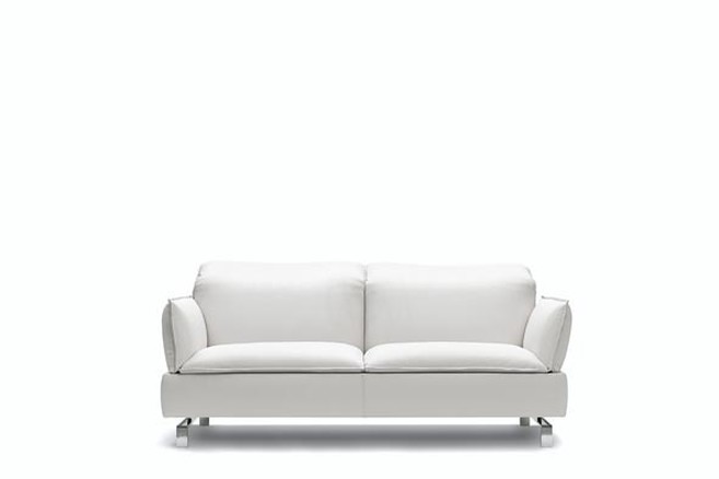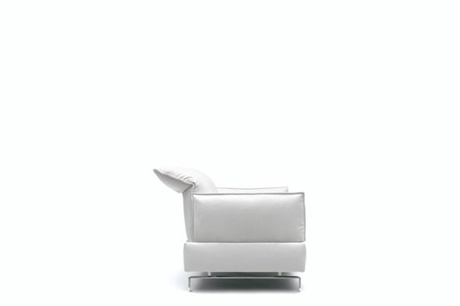 Ook de armleuningen zijn verstelbaar. Al die functionaliteit heeft een zeer eigentijdse vorm gekregen. De sofa bestaat uit een zwevend geplaatste rechthoekige basis bovenop twee metalen poten. Op die basis rusten zitkussens en licht gebogen arm- en rugleuningen die uitlopen in een spitse naad. Ook de zitkussens lopen uit in deze spitse afwerking. Elico is verkrijgbaar in de volgende afmetingen: 164 cm,184 cm, 241 cm en 271 cm.