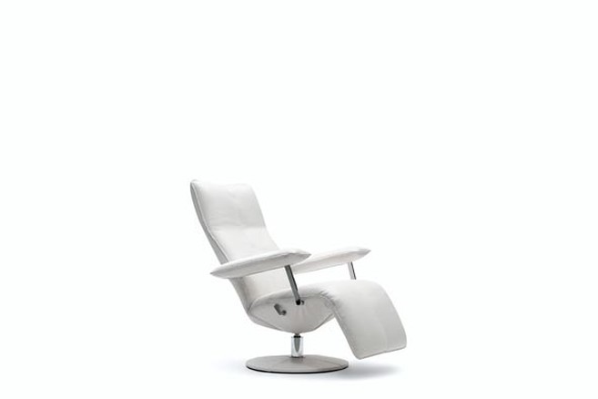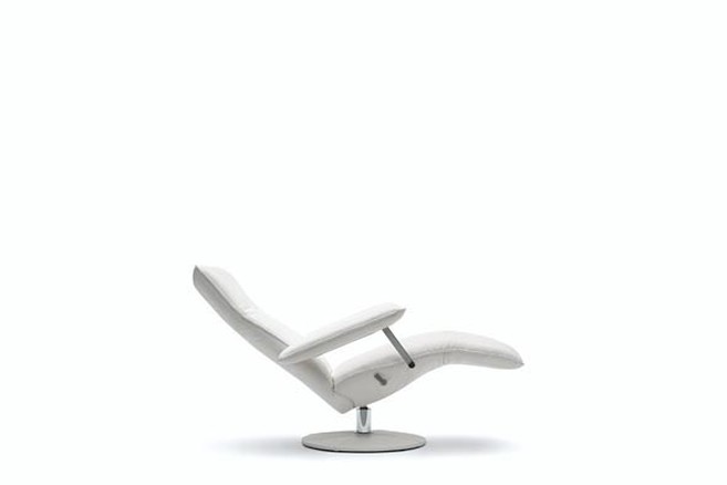 Nog een nieuwtje: de armleuning van de relaxfauteuil scharniert op drie punten; in het midden, en aan de bevestigingspunten van zit en rugleuning; aan de zit is hij verbonden door een metalen as die meebeweegt. Op die manier behoudt hij optimaal zijn positie tegenover het lichaam.
