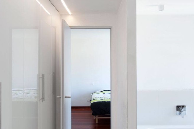 Het dwarse volume is volledig open gewerkt, zowel naar buiten toe - door middel van hoge ramen - als binnenin. De zithoek, eethoek en keuken lopen naadloos in elkaar over en zorgen voor het gewenste loftgevoel, dat de vide versterkt. De bouwheren zijn alvast enthousiast: “Door die combinatie van functies krijg je een heel open en ruim gevoel, terwijl de ruimte op zich niet overdreven groot is. De verhoudingen zijn perfect, waardoor je eveneens een geborgen gevoel krijgt.” “Ook de vide speelt hierin een grote rol”, vult de architect aan, “die deelt de ruimte in, maar sluit ze niet af.” Naast deze vide, die plaats biedt aan een ruim contactbureau met indrukwekkend werkblad in padoek, zijn op dezelfde verdieping vooraan (in het voorhuis) de bad- en slaapkamer gevestigd. Nog een verdieping hoger, onder het schuine dak van het voorhuis, werd een tweede (privé)werkruimte geïnstalleerd. Vanuit deze heldere ruimte heb je toegang tot het kleine dakterras, één van de lievelingsplekjes van de bewoners.
