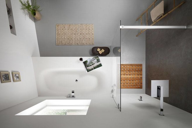 Een nieuw materiaal voor douchevloeren doet zijn intrede. Naast acryl, steen of solid surface maken we dit jaar ook kennis met een rubberen douchevloer. De ‘AquaSolidstone Soft’ bestaat uit een 3 cm dikke grondlaag van polyurethaanrubber. Deze wordt vooraf op maat geproduceerd met een helling die het water naar de afvoer leidt en wordt vervolgens op een egale ondergrond gelegd. De afvoerdekplaat is overigens ingekapseld in de rubberlaag. Het zachte materiaal neemt meteen de contouren van uw voeten aan, wat niet alleen een warm gevoel geeft maar ook ergonomisch heel interessant is. Het rubber werd antibacterieel behandeld en kreeg daarbovenop het een antislip behandeling klasse 2. Hiermee garandeert de nieuwe douchevloer zowel comfort als veiligheid.