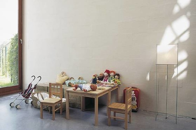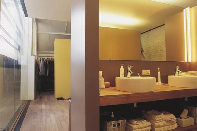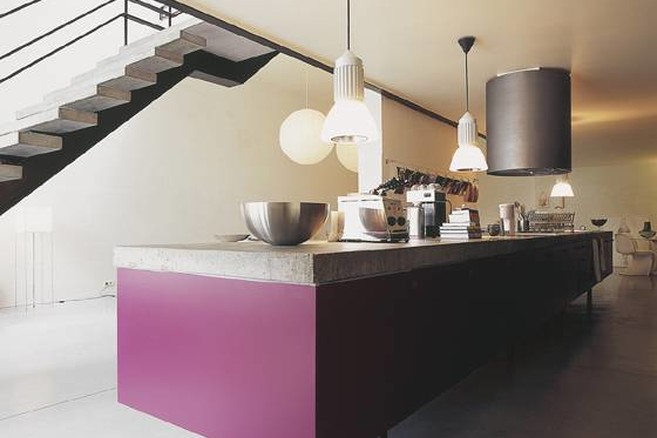 Naast open moest de woning voor Annette vooral leefbaar zijn. “Ik wilde een ‘makkelijk’ huis, eentje waar je niet de hele tijd het gevoel hebt dat niet alles aan kant is. Toen ik moeder ben geworden, besloot ik dat alles wel wat losser mocht. Een huis moet spelende kinderen en rommel kunnen verdragen.” De aankleding van de loft gebeurde in overleg met de nv Lucht, de projectontwikkelaar van het project ‘Zuidervaartje’. “We hebben bijna overal gewerkt met budgetvriendelijke materialen en toestellen”, zegt Annette. Toch heb ik helemaal niet het gevoel dat ik mij hier in een low-budgetwoning bevind, integendeel. Blikvanger beneden is de meterslange eilandkeuken met de grote stalen designafzuigkap. Voor het werkblad werd beton gebruikt, de kasten eronder bestaan uit simpele mdf-platen die, net als de muur in de kinderkamer, in het fuchsia werden geschilderd. Opvallend is ook de muur achter de keuken. Die doet dienst als enorme opbergkast. “Veel mensen vragen zich af waar onze technische installaties en toestellen staan”, aldus Annette. “Wel, die zitten allemaal verborgen in deze doorloopwandkast, van de huishoudtoestellen tot en met de verwarmingsinstallatie.” Een nadeel van een open loft is de warmtecirculatie. “De benedenzones zijn inderdaad kouder dan de ruimtes boven”, geeft Annette toe. “Maar ja, elk huis heeft zijn voor- en nadelen, je leert er mee leven. Bovendien kan je dergelijke temperatuurschommelingen opvangen door middel van vloerverwarming en ventilatie.”