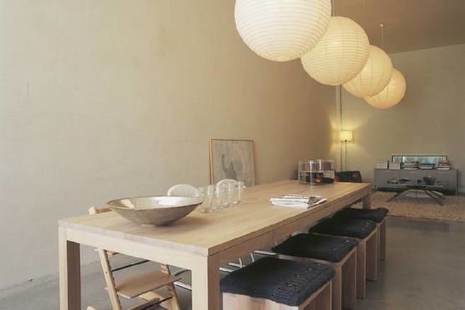 Hoewel de voormalige fabriek in erbarmelijke staat was toen ze werd opgekocht, werden er zoveel mogelijk authentieke elementen gerecupereerd. Het originele dak en de oorspronkelijke buitenmuren geven het gebouw een industriële charme. Om de zestien lofts van elkaar te scheiden en er aparte ruimtes in onder te brengen, werden er wel overal nieuwe binnenmuren geplaatst. Omwille van de snelheid en het comfort gebruikte de projectontwikkelaar hier Ytongblokken (Xella) voor. In de loft van Annette en Tim werden de binnenmuren witgekalkt om een ruw effect te bekomen. Samen met de open inrichting ontstaat er zo een zuiver loftgevoel. De enorme ronde lampenkappen vullen de ruimte op de gelijkvloerse verdieping zodat het interieur niet leeg of kil oogt. “Ik ben helemaal tevreden met hoe de loft er nu uitziet”, zegt Annette. “Ik ben ook gestopt met het kopen van nieuwe decoratiespullen, anders blijf je bezig. Als iets goed is, moet je het niet meteen weer veranderen.”