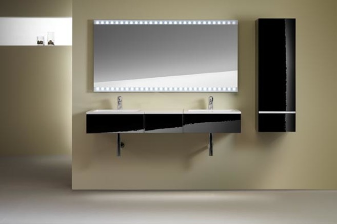 Een spiegel van gezandstraald glas voorzien van 2 verlichtingsstroken met witte powerled-verlichting vervolledigt het geheel. De spiegel is beschikbaar in 2 verschillende afmetingen (1,00 en 1,60m), afgestemd op de breedte van de modules.