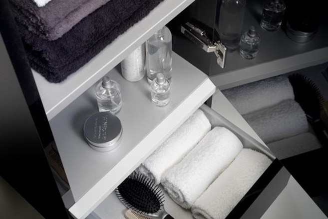 Het kastje naast of tussen de wastafel(s) heeft niets gemeen met een traditioneel badkamerkastje. Danny Venlet ziet een kastje als een afsluitbaar opbergvak met handige houten inzetbakjes. Dankzij het deksel van het opbergvak wordt de flesjes- en potjeswanorde aan het zicht onttrokken.Een spiegel van gezandstraald glas voorzien van 2 verlichtingsstroken met witte powerled-verlichting vervolledigt het geheel. De spiegel is beschikbaar in 2 verschillende afmetingen (1,00 en 1,60m), afgestemd op de breedte van de modules.
