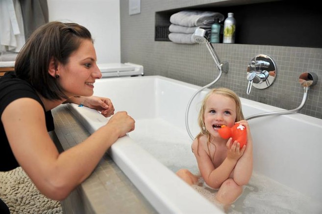De badkuip voor de kinderbadkamer is lager. Zo kunnen ze gemakkelijk in- en uitstappen zonder te vallen. Een bad en douche kun je perfect combineren door met een douchegordijn te werken. Voorzie zeker ook een antisliplaag en badmat wanneer ze uit bed stappen.Thermostatische kraan