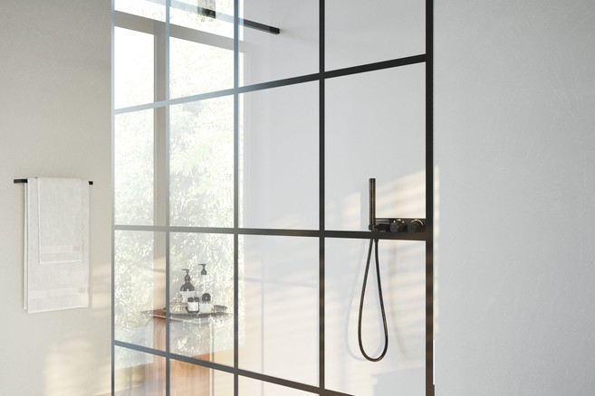 De douche kan afgebakend worden met een gemetselde wand, een gordijn of panelen in (plexi)glas