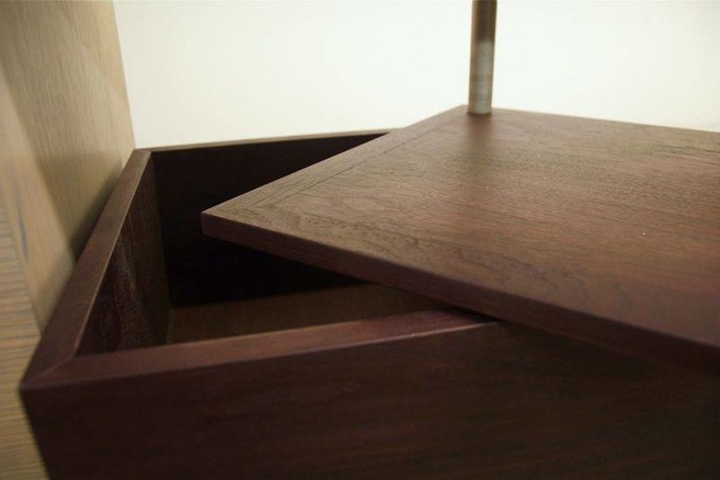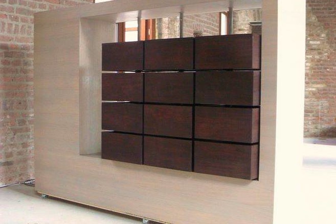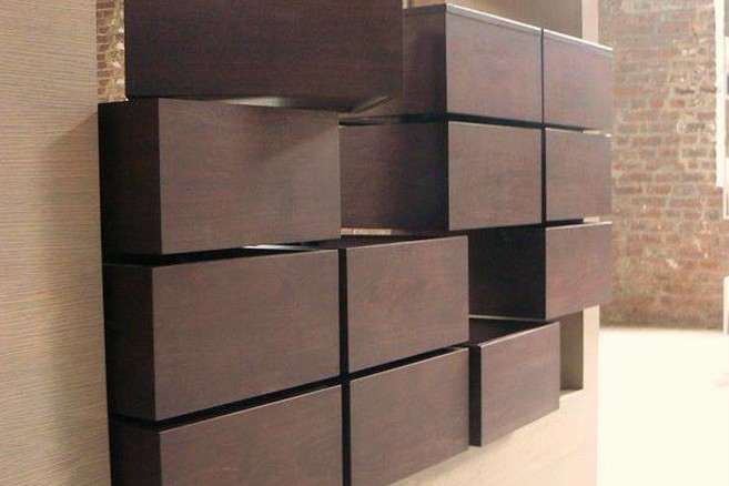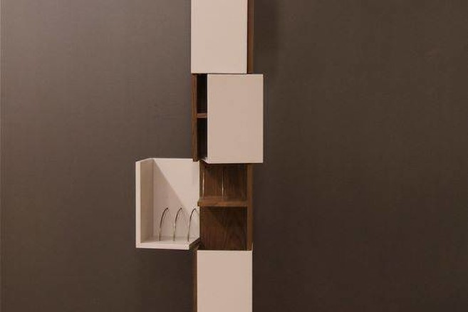 Het resultaat is een erg ruimtelijk object met 12 laden verdeeld over 4 rijen en 3 kolommen, die elk een kwartslag kunnen draaien rond een verticale stang. Doordat in elke rij één plaatsje vrijgelaten is, krijg je maar liefst 256 mogelijke configuraties om eindeloos mee te variëren.