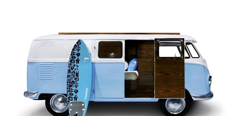 Het op de VW Minivan geïnspireerde bedbusje is vervaardigd uit glasvezel en chroom, en palissander houtfineer aan de binnenkant.