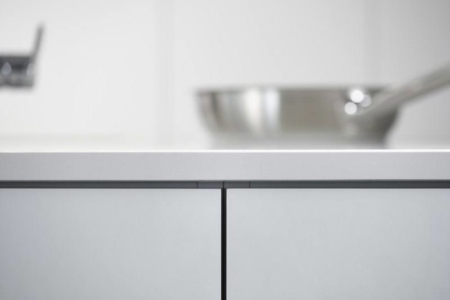 Bij frontlaminaat zit de afboording van de kastdeuren tussen de laminaatlagen van de voor- en achterzijde. Het fijne donkere lijntje is dus nog aanwezig, maar je ziet het niet meer als je een kastdeur frontaal bekijkt. Daardoor krijgt een keuken een zeer strak design en een architecturale look.