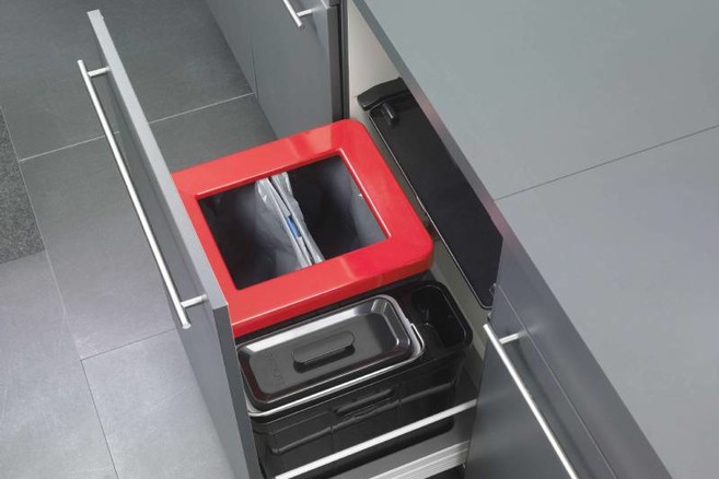 Ook inzake bediening van het afvalsorteersysteem zijn er verschillende mogelijkheden: Basic (handbediening via greep), KickMatic (handenvrije bediening via een roestvrijstalen pedaalsysteem op de sokkelplint) of Motion (gedempte, automatische sluiting). De 3 bedieningssystemen maken gebruik van ladetechniek van Blum.