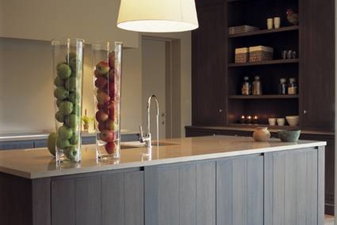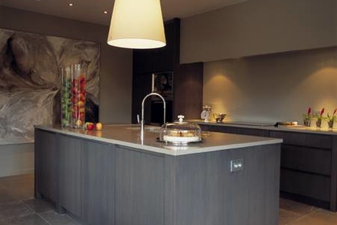 Centraal in de woonkeuken pronkt een royaal eiland, waarvan alle zijden benut werden als bergruimte. Het kookgedeelte is tegen een wand geplaatst en wordt overkoepeld door een strakke constructie waarin een ruim bemeten dampkap is weggewerkt. Donkere eik wordt hier gepaard aan ‘Bleu de Tavel’ voor de werkbladen.
