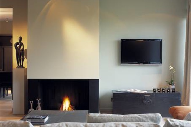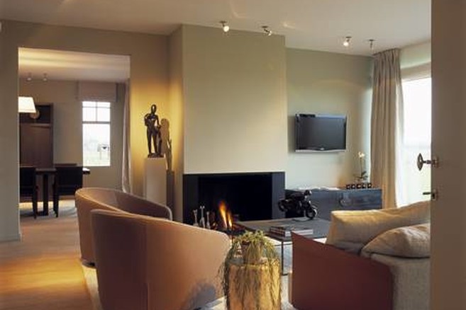 De woonkamer met strakke open haard, kijkt via een breed kamerhoog raam uit op de tuin en aanpalende landbouwzone.