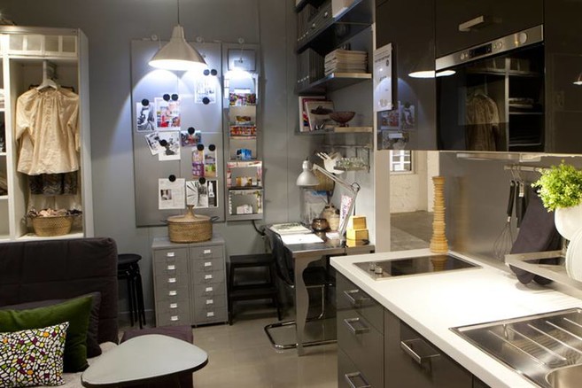 De keuken neemt het grootste deel van de beschikbare oppervlakte in. De bewoners doen de moeite om te organiseren. Zo vinden ze altijd snel het juiste kookgerei . Voor de messen gebruikt het koppel een magneetlijst, ze bergen kruiden op in een kleine kast en ze werken met rails met haken en houders aan de wand om werkruimte vrij te houden. In de ladenkasten kunnen ze snel aan alle potten en pannen. Achter de laden zit het afvalsorteersysteem verborgen.