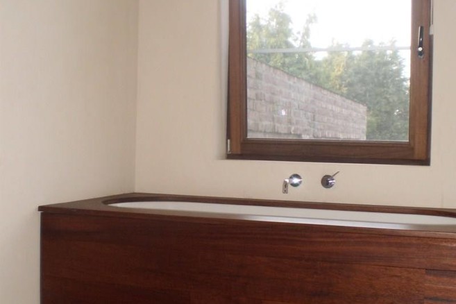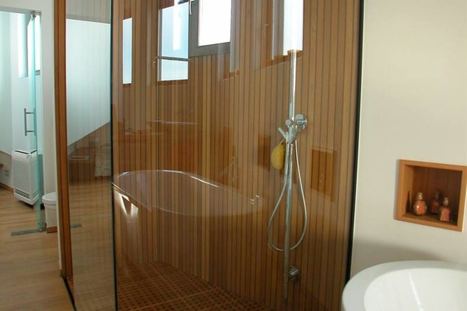 Wist je dat hout ook kan worden gebruikt in de douche? Op voorwaarde dat je enkel zeer stabiele en zeer duurzame houtsoorten gebruikt. Om het risico op vochtopname te beperken moet de houtsoort niet-poreus zijn en een gesloten nerf hebben. Geschikt voor deze veeleisende toepassing zijn houtsoorten als afrormosia, ipé, itauba en teak.Voor gebruik in de douche beveelt Belgian Woodforum het gebruik van massief hout aan, idealiter in verticale richting om het aflopen van het water te vergemakkelijken. De plaatsing moet zo gebeuren dat de kopse uiteinden van het hout niet in contact komen met water.