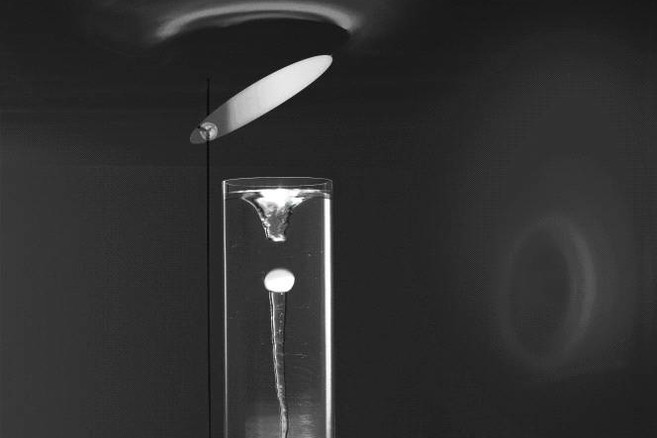 Designer Ingo Maurer ontwierp de lamp met de ongebruikelijke naam met even ongebruikelijke materialen. Delirium Yum is niet meer of minder dan een conische glazen vaas gevuld met water die op haar beurt op een dienblad van 40 bij 40 cm is geplaatsts. Onder dit dienblad zijn een halogeenspot en vijf besturingselementen verwerkt. Een magneet op de bodem van de vaas activeert de kolkende beweging in het water. De besturingselementen laten toe het spotlicht te dimmen, de draaisnelheid van de kolk te bepalen en het licht en water afzonderlijk te laten werken.