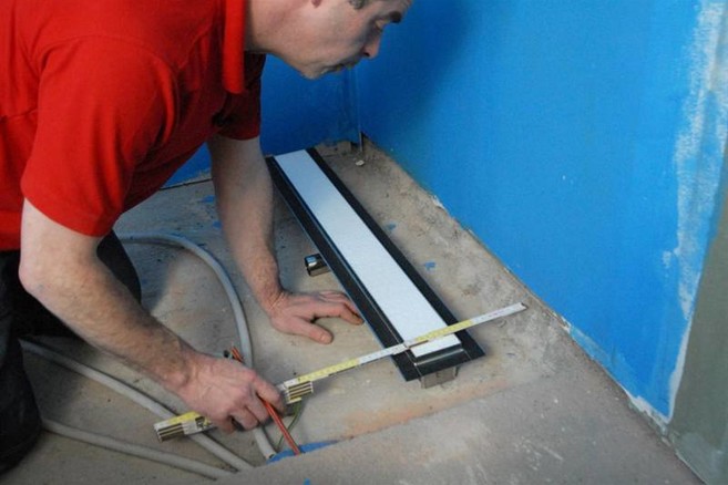 - De gemakkelijkste manier: een paar centimeter van de betonnen dekvloer wegnemen voor een aflopende douchevloer, die je wilt betegelen of bekleden met een coating of gietvloer. Daar waar de afvoer of afvoergoot komt, heb je wel meer diepte nodig. De exacte inbouwhoogte is afhankelijk van het model van douchebak of douchegoot en het al dan niet bijgeleverde installatiesysteem