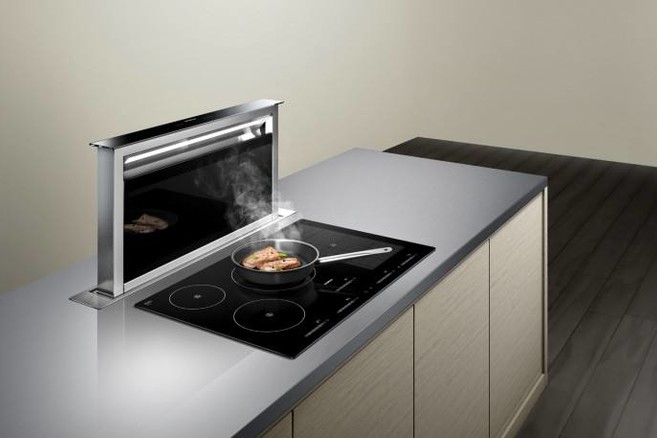 - De telescopische dampkap verbergt zich achter een deur en verschijnt alleen wanneer je ze nodig hebt.