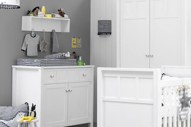 Ook deze kamer van Coming Kids is omvormbaar en uitbreidbaar van babykamer tot tienerkamer. Een babykamer met babybed, commode met verzorgingstafel en kleerkast. In de tienerkamer staat een bureau, open kast en bedbank. De basis blijft wit, zo hoef je niet om de 3 jaar van kleur te veranderen.Meer info: Coming Kids