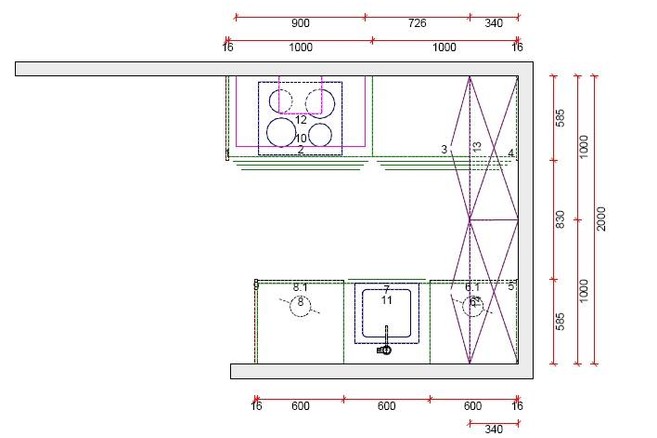 De 2 meter beschikbare ruimte tegen de binnenmuur laat toe om een keukenblok met 3 kasten van elk 60cm breed aan te bouwen. Eén kast is dus bestemd voor de vaatwasser, in de middelste kast laten we de spoelbak inbouwen, met daaronder een lade met ruimte voor meerdere vuilemmertjes en op de kop van dit keukenblok komt de derde kast met daarin de koelkast.