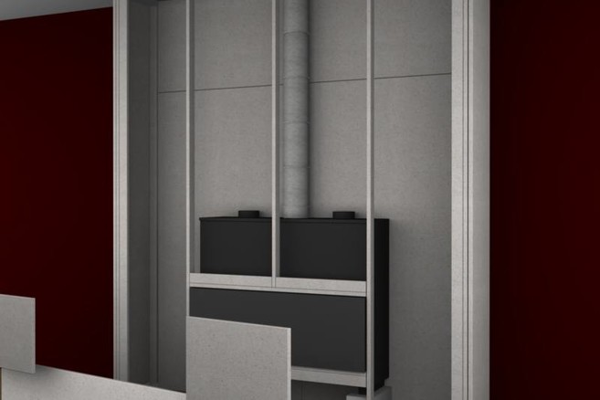 Bij het ontwerp van het maatmeubel dient de interieurontwerper ook rekening te houden met voorzieningen zoals lucht aan- en afvoer. “De aanvoer van verbrandingslucht kan op twee manieren: ofwel uit de ruimte, ofwel via een buis uit een andere ruimte of van buiten,” licht Yvan Van Gucht toe. “Om de warme luchtafvoer te verwezenlijken, moet er ook aanvoer van frisse lucht zijn. Die moet wel uit dezelfde ruimte komen, en liefst gescheiden van de verbrandingslucht.”