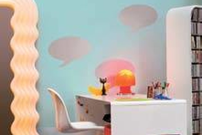Pepermunt op de muren werkt verfrissend naast het neutrale Rook op de lijsten en creëert een rustige werksfeer (foto 2). Zorg voor extra cachet door verrassende tekstballonnen in funky metallic Disco.