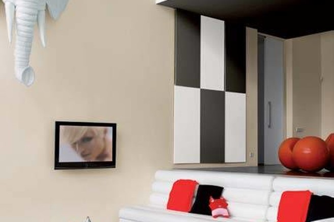 Ga voor een eenvoudig, sterk contrast met een knipoog (foto 3). Donker LP op de plafonds getuigt van durf, het grafische spel met Plastic voegt humor toe. Het zachte Skai houdt het geheel samen en vormt de achtergrond waartegen de accenten aan impact winnen.