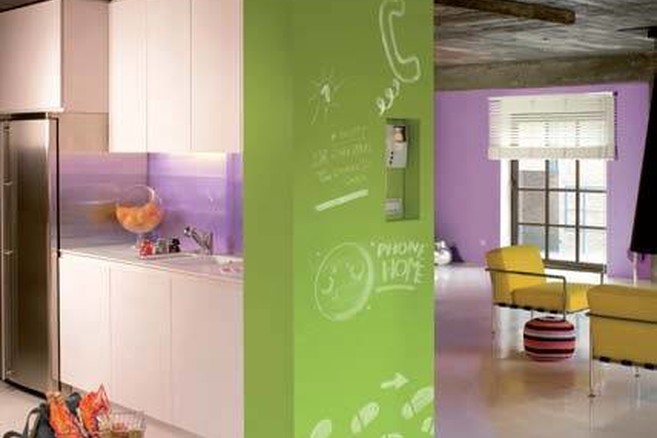 Krachtig Retrogroen voor het keukenblok, in toom gehouden door het Diva op de muren achteraan in de ruimte (foto 4). Chewing gum rond de gootsteen zorgt dan weer voor een zachtere sfeer. De bordverf Tablo kan je in elke kleur krijgen op de Levis-mengmachine. Laat je inspiratie werken: tekeningen, dessins… het leven is meer dan boodschappenlijstjes alleen.