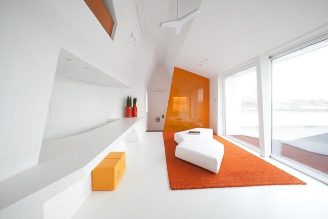 “De loft vroeg om een maximaal ruimtegevoel, dit creëerden we met vaste en transparante wanden”, zegt architect Ben Wouters van PCP. “Het eerste niveau richtten we strak in met een boventoon van zwarte en witte tinten. De contrasttint oranje zorgt voor een verrassend effect. De verdiepingsruimten op niveau 5 en 6 zijn rond een bar ingericht. In schril contrast met de benedenruimte werkten we daar met wanden en plafond uit gefaceteerde vlakken, die het gevoel tussen wand en plafond doen vervagen.”