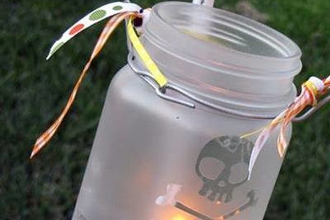 - Maak een pad van theelichtjes in oude glazen bokalen