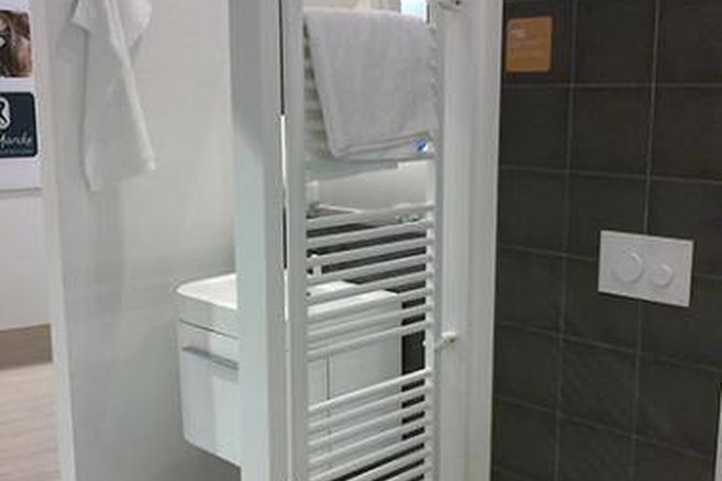 Op de radiator kun je ook nog eens de handdoeken laten drogen. Weer winst.