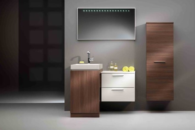 De vormgeving van de wastafelkast springt onmiddellijk in het oog. De opzetwastafel staat op een L-vormig element dat over de wastafelkast is geschoven. Dankzij de specifieke vormgeving van dit element wordt de afvoerbuis aan het oog onttrokken.