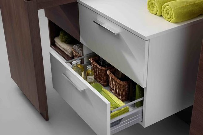 Tussen de 2 wastafelblokken van de dubbele wastafel bevindt zich een ladekast. Bij de enkele opstelling zit de ladekast naast het wastafelblok.