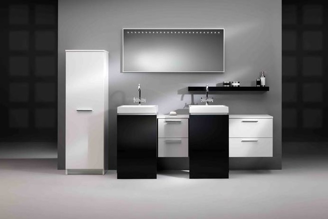 De slanke, glanzend chroomstaafgrepen op de laden van de wastafelkast en de kolomkast maken het geheel af.