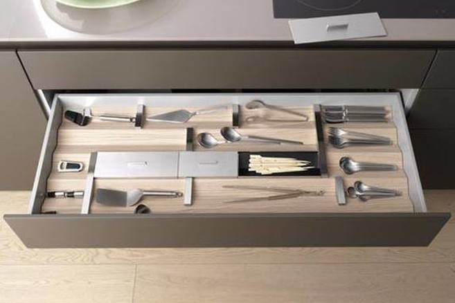 Bulthaup heeft voor hun keuken b3 een systeem met lades en uittrekelementen ontwikkeld dat mensen in staat stelt om hun opbergopties flexibel en individueel vorm te geven.- Het nieuwe systeem is zo flexibel dat het bijvoorbeeld ook onder de kookplaat geïnstalleerd kan worden.