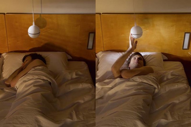 Wekkerradio Sfera staat niet naast je op het nachtkastje, maar hangt boven je bed. Wanneer je het alarm instelt, dimt de gloeiende Sfera zachtjes uit en stopt de muziek met een fade out.