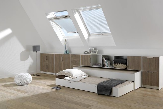 Onder een schuin dak kun je de verloren ruimte best opvangen door er een handig meubelsysteem te installeren. Met het ruimtewonder Plexat kun je heel wat opbergen zonder dat je aan ruimte inboet.