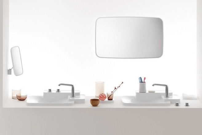 Bij de wastafel bieden de tabletten niet alleen veel plaats voor persoonlijke spullen maar zijn zij tegelijkertijd ook de basis voor de keuze van oneindig veel compositie-mogelijkheden van kraan en wastafel. Inderdaad, de uitloop en de grepen kunnen vrij geplaatst worden - en wel precies daar waar zij in de individuele situatie gebruikt gaan worden: bijvoorbeeld op een plaats die voor kinderen makkelijk bereik-baar is of die zich uitstekend leent voor linkshandigen of die kenmerkend is voor iemands persoonlijke smaak. In combinatie met de wastafels die als wand- of inbouwmodel met één of twee geïntegreerde tabletten verkrijgbaar zijn, vermenigvuldigen de vormgeving- en indelingopties zich verder. “Uiteindelijk heeft iedereen de vrijheid om te beslissen welke oplossing voor hem of haar de beste is”, verklaren Ronan en Erwan Bouroullec.