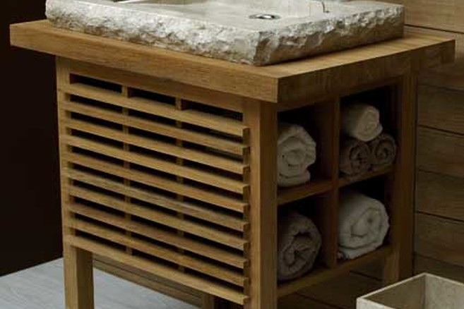 Kies voor een hoge kast. Een lage kastje heeft geen zin, want deze gebruikt toch hetzelfde vloeroppervlak. In een hoge kast kun je tegen de deur nog een spiegel plakken. Dan moet je daar geen extra ruimte voor voorzien.