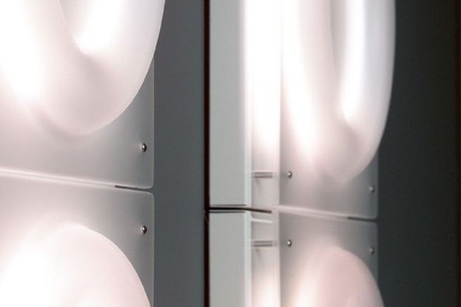 SKIN MOON zal verkrijgbaar zijn in twee sferen. SKIN MOON ICEBERG roept vooral de sfeer van het koude, ijzige noorden op. Het kleureffect van de lampen 1x T5C 55W, 3x T5 8W, 2x T5 24W of LED White 9x 1W wordt telkens gecombineerd met een SATIN gethermoformeerde polycarbonaat.