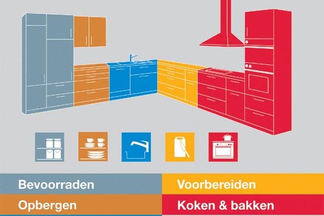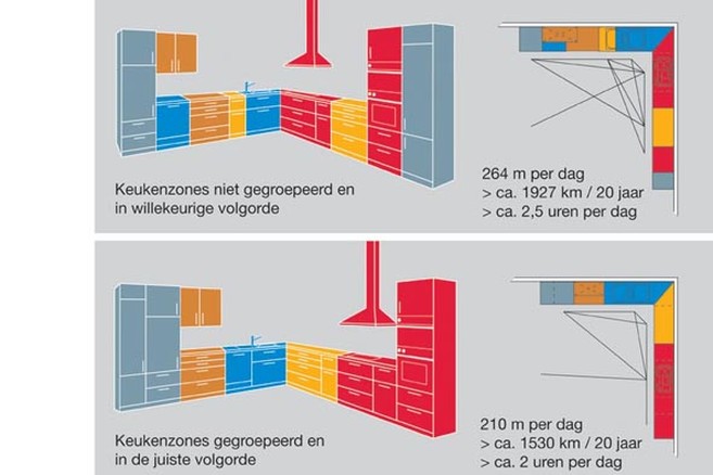 Om de loopafstanden te beperken, kan je de keuken opdelen in zones. Een opdeling volgens een uitgedacht concept beperkt het heen en weer geloop in de keuken met 25% en maakt de keuken een stuk meer ergonomisch.